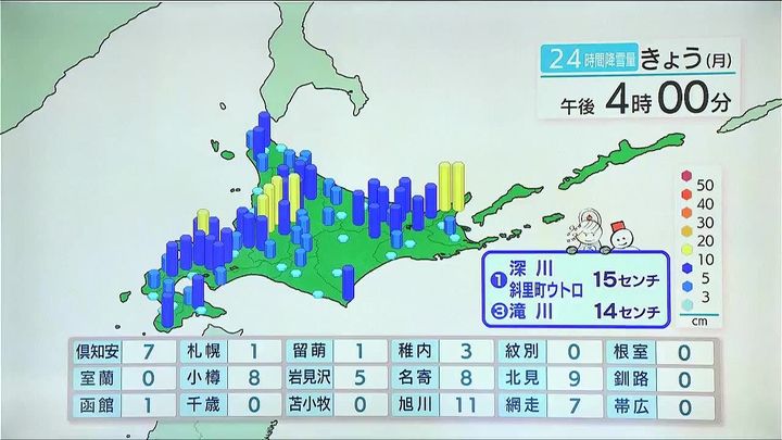 きょう31日(月)の午後4時までの24時間に降った雪の量ですが、広い範囲で降りました。内陸や山沿いで多くなり、北空知の深川と網走東部の斜里町ウトロで15センチでした。あす4月1日は道内広く晴れそうです。