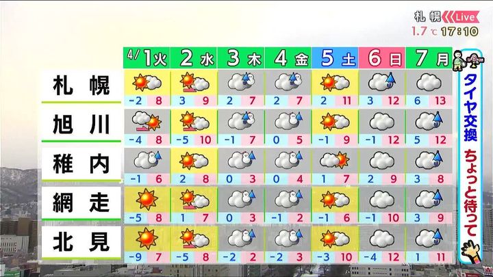 北海道のあす4月1日(火)の天気と、週間予報を、HBCウェザーセンターの児玉晃(こだま・あきら)気象予報士がお伝えします。