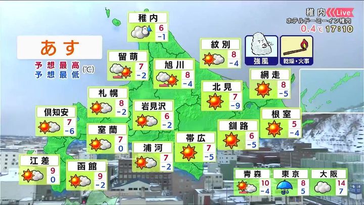 昼頃にかけて稚内や名寄、羽幌で湿った雪の降る時間があるでしょう。午後は広く晴れる見込みです。稚内周辺や空知地方でも風が強まりそうです。