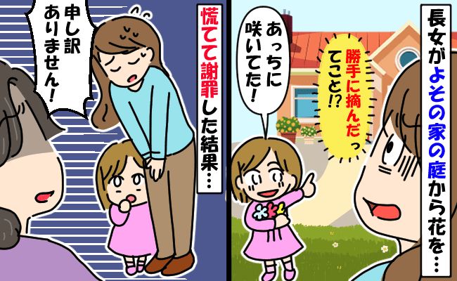 長女が3歳だったある日、私が少し目を離した隙に近所の家の庭から花を摘んできてしまいました。これはいけないと思い、長女とその家まで謝罪に行ったところ……。