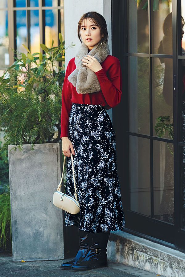 スカート¥3,480/ハニーズ ニット¥3,630、ファーマフラー¥2,090/ともにアストリア オディール(アストリア オディール ルミネエスト新宿店) ピアス¥16,500/マナ ローザ ジュエル(マナ ローザ) バッグ¥17,600/アドカラム(アンソロジー) 靴¥39,600/ダイアナ(ダイアナ 銀座本店)