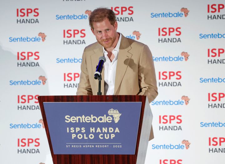 Prince Harry, Duke of Sussex speaks at the Sentebale ISPS Handa Polo Cup 2022