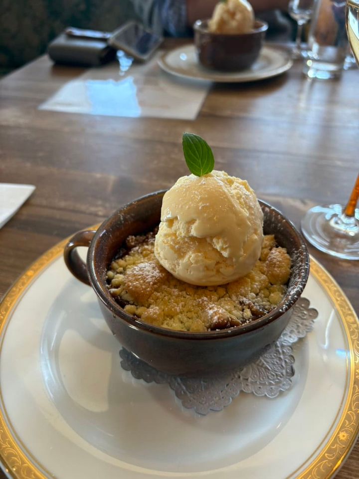 ボリュームのあるサイズ感が嬉しいアップルクランブル。熱々のシナモンアップルとバニラアイスの組み合わせを料理の締めくくりに。Bernd's kellerはゲレンデの真横に位置しているので、スノーシーズンはスキーやスノーボードを楽しんだ後に訪れたい白馬の名店です。