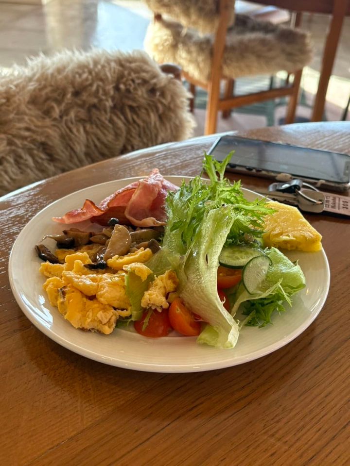 サラダをたっぷりといただきました。パンやチーズ、ヨーグルトなど、動き出す前にしっかりパワーチャージ。