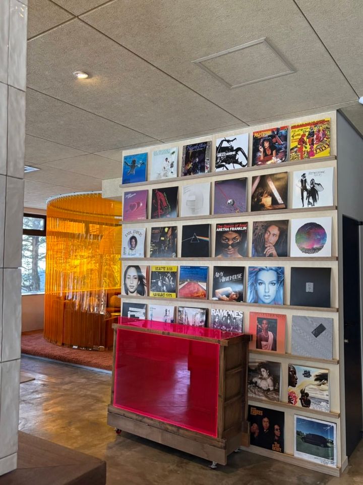 ロビー横には70年代から90年代のレコードがずらり。奥には実際にレコードを聴けるスペースもありますよ。