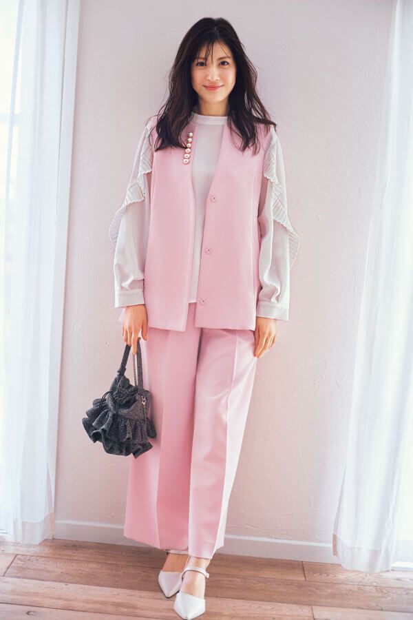 桜カラーのジレのセットアップは胸元についたパールボタンでより上品さが加速。中に袖フリルブラウスを仕込んで、きちんと感がありながらも華やかな佇まいを実現。