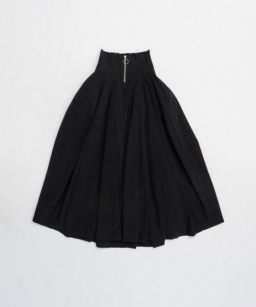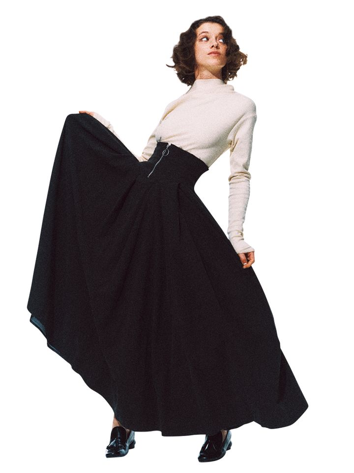 きゅっとしまったくびれデザインに、着るだけで高揚感をもたらす広がりのいいフォルム。色はいつもの黒なのに、ある意味派手にも見えるルックスを形成。素材はナチュラルな雰囲気が出る、ハリのあるコットン。白リブトップス、黒ボリュームスカート/ともにプランクプロジェクト