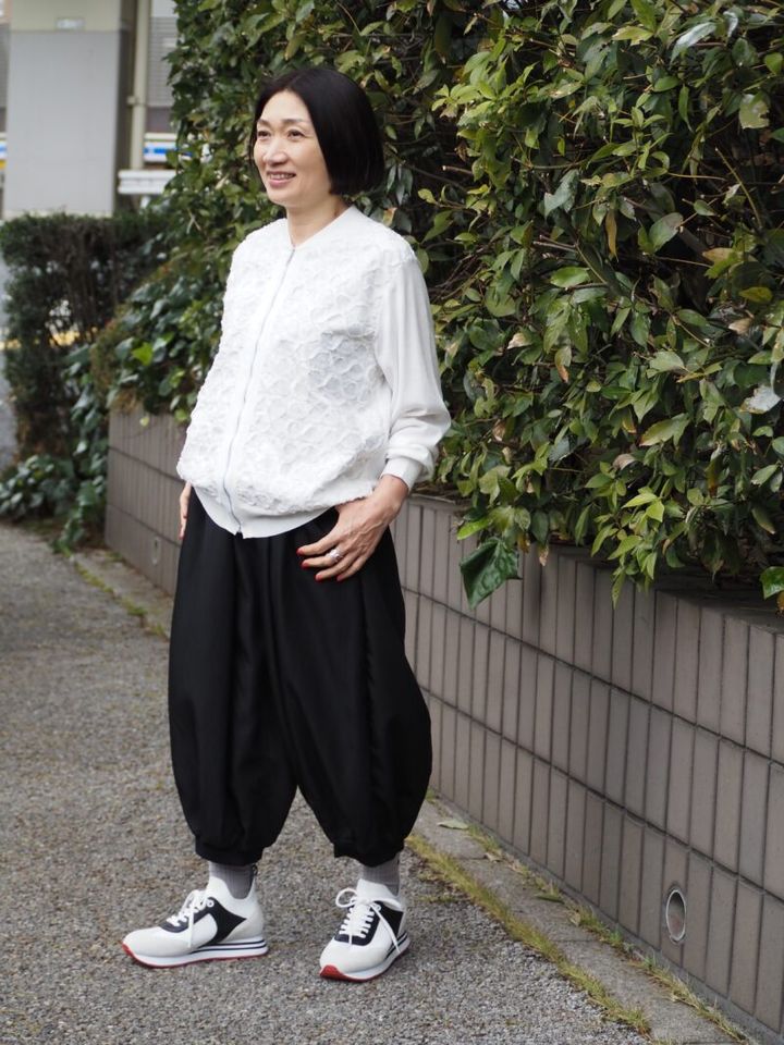 「ケイ ハヤマ プリュス」のジップアップカーディガン。この日の金さんは、ファスナーを上げてトップスとして着用。美しいドレープと丸みのあるシルエットのボリュームパンツのワンツーコーディネートの完成です。シンプルな組み合わせも、デザインがきいたアイテム同士をかけ合わせることで鮮度の高いスタイリングに。