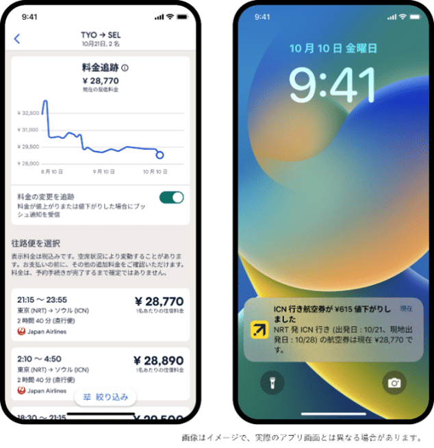 エクスペディアアプリ「プライストラッカー」を利用することで、航空券の価格変動が常時把握できるプッシュ通知設定が利用できます。これさえあれば旅行者にとってお得なタイミングを見逃さず予約できるように!また、エクスペディアで航空券とホテルの両方を予約するとセット割が可能になるので、飛行機移動を含む旅行を検討しているなら、ぜひアプリを活用してみてください。