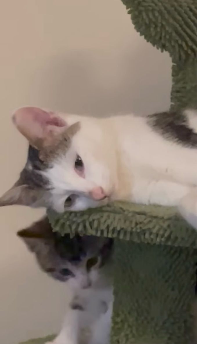 キャットタワーの上で楽しく遊ぶ子猫たち。 そんな賑やかな中に、ひとりだけ静かにまどろむネコの姿がありました!