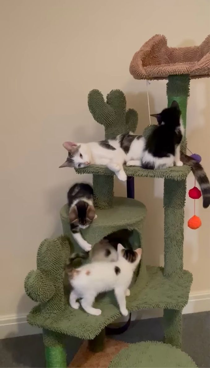 キャットタワーの上に集まって、みんなで楽しく遊ぶ子猫たち。