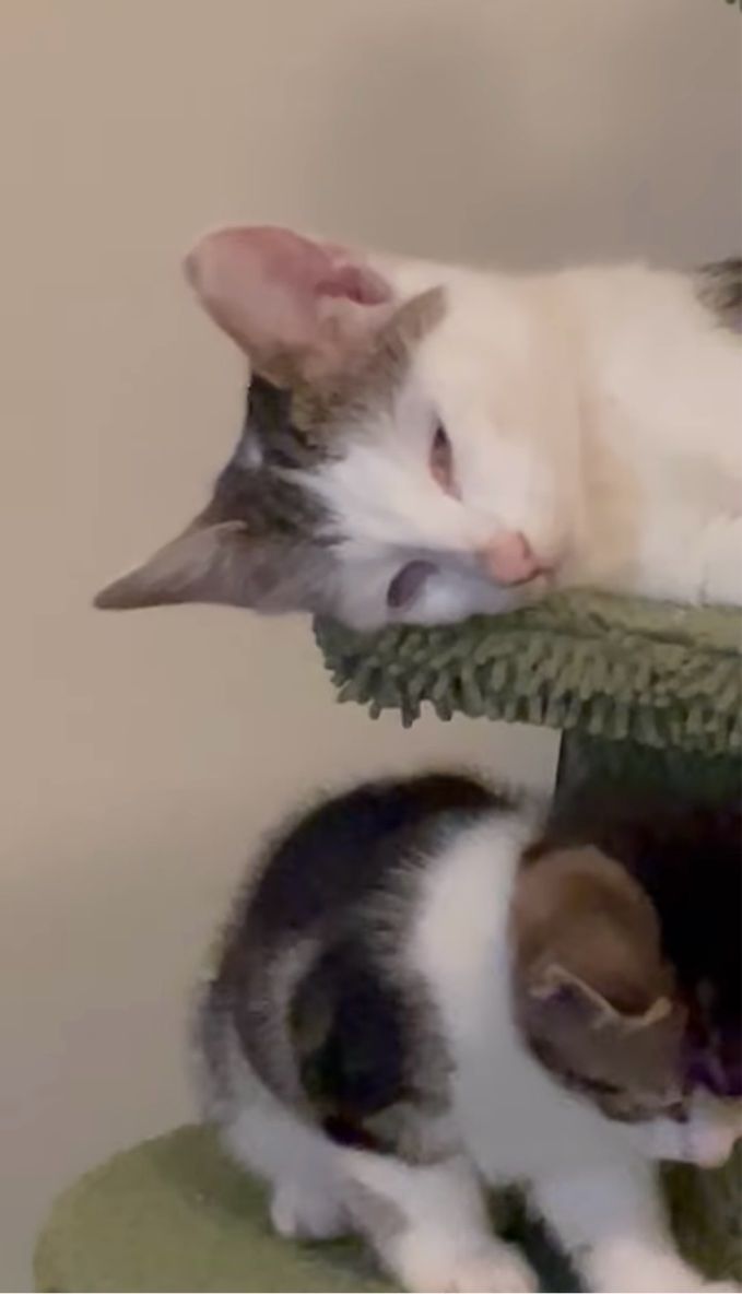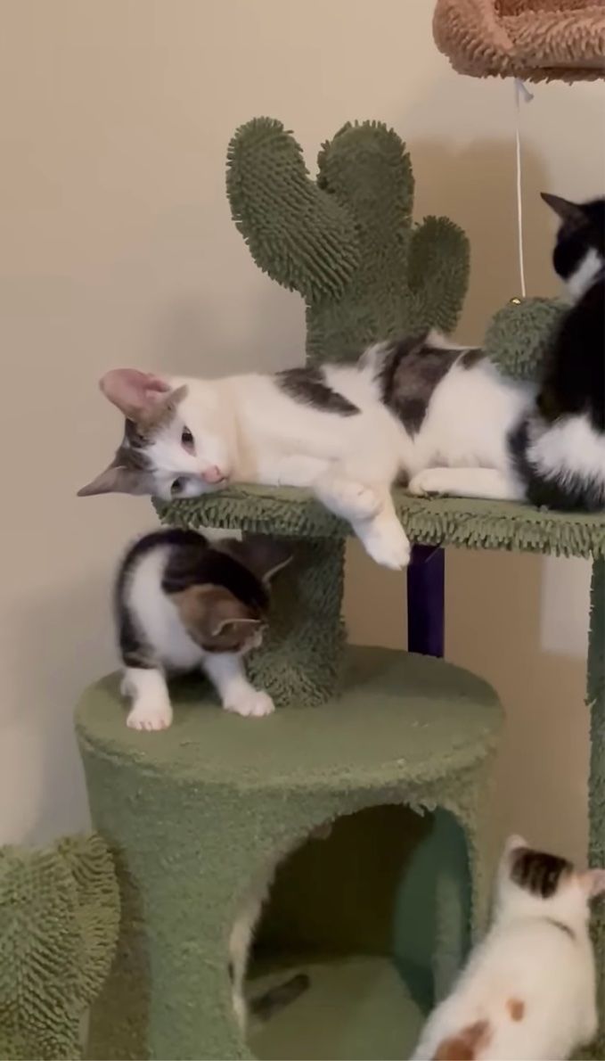 キャットタワーの上で楽しく遊ぶ子猫たちに囲まれて、ひとり静かにまどろむネコ。 子守りに疲れたかのようなその姿は、こちらの動画からご覧いただけます。