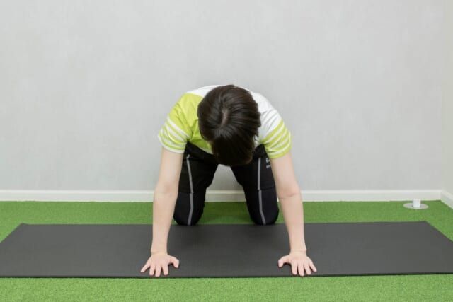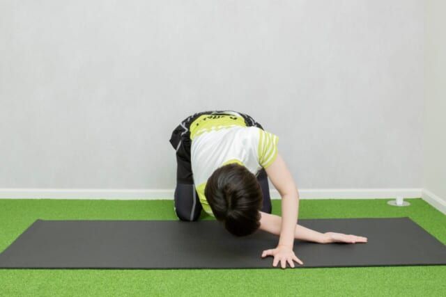 ▲肩が床についてしまうと、腕を遠くに伸ばすことができないので、肩を床につけないように心がけましょう