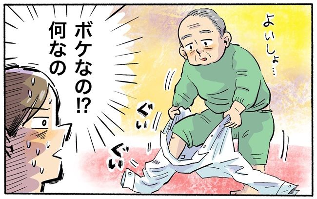 祖父はテレビを見ながら着替えを進めるのですが、あきらかに行動がおかしかったのです。たとえば、パジャマをまだ脱いでいない状態でシャツを足からはこうとしたり、下着を頭からかぶろうとして「頭が出ない」と困っていたり……。そのうち着替え自体をやめてしまいました。私は祖父がふざけているのか、真剣なのかわからず、何も言わずにそこにいるしかできませんでした。