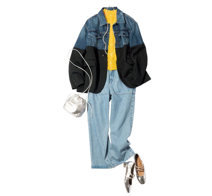 異素材が目をひくデニムのジャケットを主役にデニムパンツを合わせてトレンド感満載に。パーソナルカラーにマッチするイエローのトップスとラウンドトウのパンプスで女性らしさをプラス。 アクセや小物をシルバーにして統一感を意識しました。