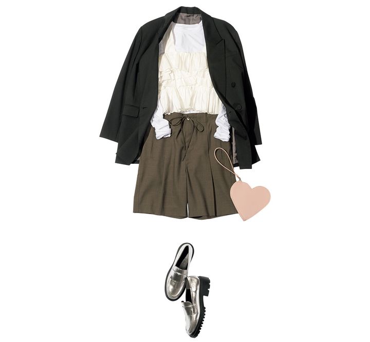 フリルベストセットロンT ¥17,930 ダブルブレストジャケット¥24,200 ハートミニクラッチバッグ¥2,970 ローファー¥14,300〈すべてアダム エ ロペ〉ショートパンツ¥60,500〈フランケン〉(すべてアダム エ ロペ)アクセサリー(スタイリスト私物)