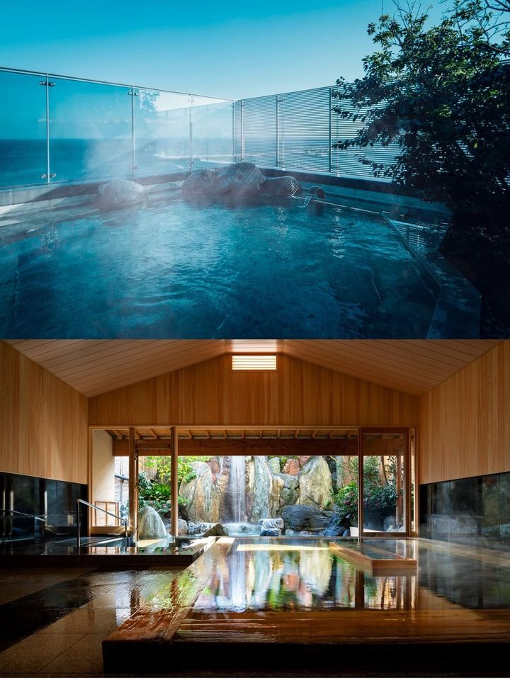 泉質の違う2つの温泉を楽しめる! 上:「界 アンジン」はアルカリ性単純温泉。下:「界 伊東」はカルシウム・ナトリウム―硫化物・硫酸塩温泉。