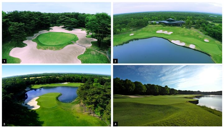 (左から)①ホウライの名物ホール、バンカーに囲まれたグリーンを狙う8番パー5。②広大な池を望むホウライ9番・18番。③西那須野名物、ビーチバンカーが待ち構える7番パー5。④左サイドはすべて池、大きな5段グリーンの西那須野9番パー4