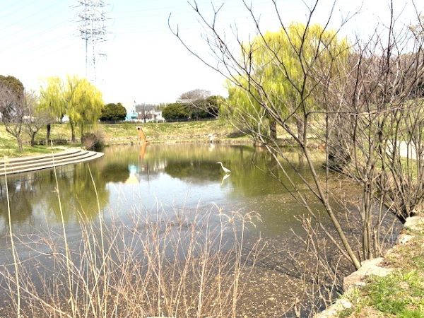 斜面の先には池があり、野鳥の姿を見ることも!穏やかな景色が広がります。池の周りを1周できる遊歩道もあるので、散策にはピッタリです。