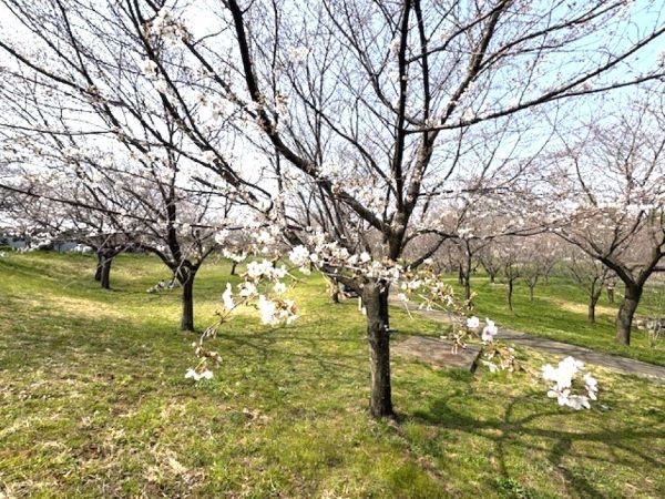 訪れたのは3月27日(木)。とても暖かな日でしたが、桜は2~3分咲き。満開時にはまるで桃源郷のような場所になる隠れたお花見スポットです。早くも、レジャーシートを広げたり、散策をしたり、ワンちゃん連れの方など、お花見を楽しんでいる方々がいらっしゃいました。