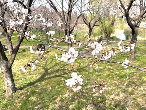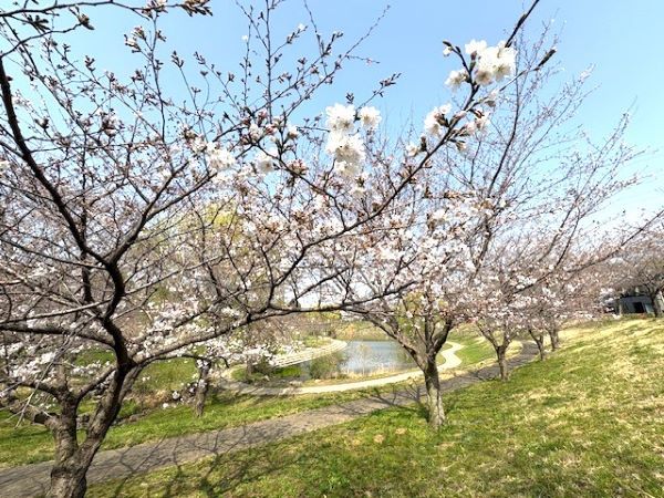 イメージとしては、ゆるやかな斜面に桜が植えられていて、低い場所に池がある公園。高低差があるのでさまざまな角度から桜を愛でることができるのです♪