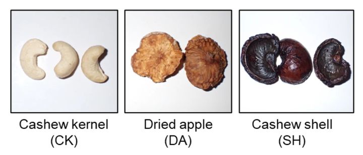 研究チームは、ベトナム産のナッツ、ブルキナファソ産のアップル、そして日本企業から提供されたシェルを、それぞれ70%エタノールで抽出しました。
