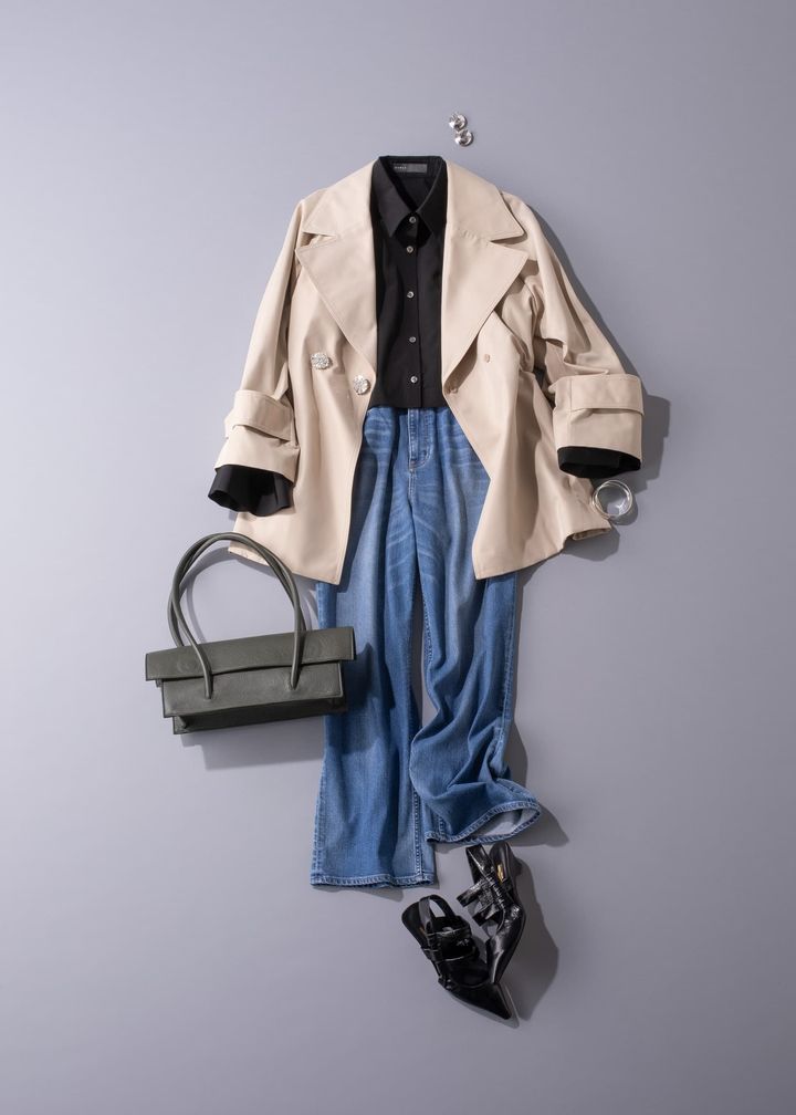 シャツ×デニムの究極のシンプルコーデには、ショート丈でワイドな衿がポイントの今が旬のトレンチコートを羽織って。大きめビジューボタンが春らしい華やかさを演出してくれます。