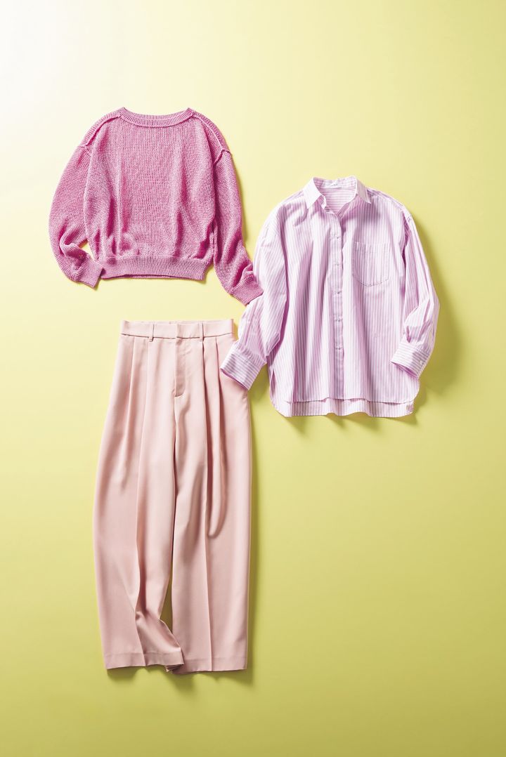 A ほんのりインナーが透けるローゲージ具合が、お仕事コーデ抜け感を作り出す。ニットプルオーバー¥15,950(アダム エ ロぺ)B ストライプシャツなら職場でのピンクでも気恥ずかしさゼロ。シャツ¥8,910(ミラオーウェン/ミラオーウェンルミネ新宿2店) C デイリーに着まわせるタックパンツは、ピンクでまわりと差をつけて。パンツ¥12,100(ミラオーウェン/ミラオーウェンルミネ新宿2店)