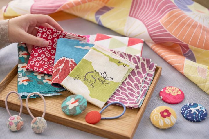 さらにこのプランでは、風呂敷を作る過程で発生したハギレを使用して、ヘアゴムや缶バッジ作りが楽しめます。これはむす美のエコの取り組みの一つとして行っている活動なんだとか。色とりどりの風呂敷から好みの柄を選び、好きなアイテムに作り替えて、旅の思い出として持ち帰れます。