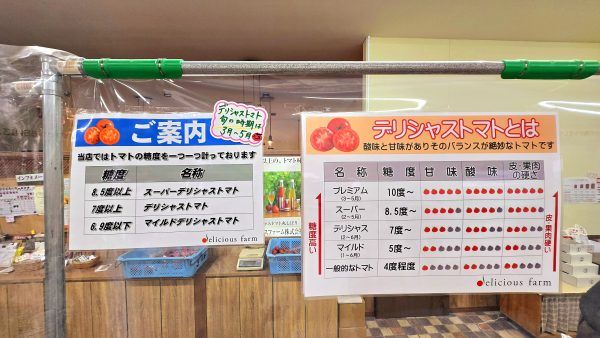 お目当てのトマトはこんな感じでケースに入って売られています。「糖度」「甘味」「酸味」「皮の硬さ」「傷ありなし」など、種類別に並んでいました。