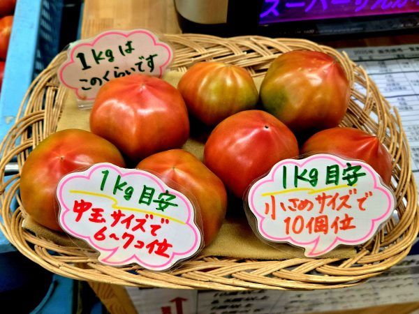 グラム売り、「1kgってどのくらいだろ?!」と思っていたら、写真のように1Kgの目安が置かれていて分かりやすかったです。購入するときも「トマトの大きさの希望はありますか?」と聞いてくれました。