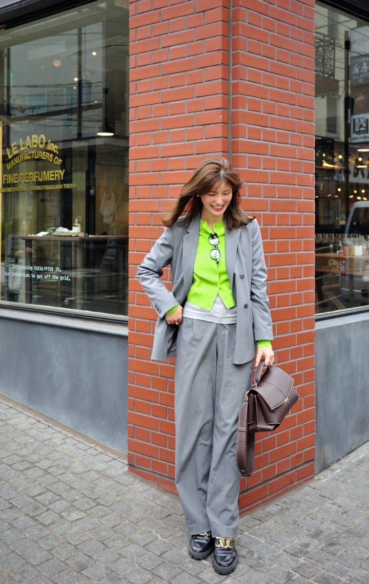 「落ち着いた雰囲気のライトグレーのジャケパンは、派手色を挟んでオフスタイルに。上下ユニクロを着る時は、アクセントとなるような色を取り入れたり、トップスをレイヤードさせることで、一気に洒落感がアップするような気がしています」