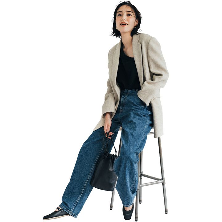 ニット¥28,600(フィーニー)ジャケット¥45,100(プラージュ/プラージュルミネ有楽町店)デニムパンツ¥18,700(ステュディオ アール スリーサーティー)ピアス¥20,900(ローラ ロンバルディ/八木通商)バッグ¥42,900(バケット バゲージ/アイネックス)シューズ¥72,600(レペット/ルック ブティック事業部)