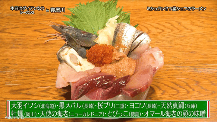 実はロッカクエビノは、「日本で一番海鮮丼がおいしいラーメン屋」をうたっている。具材はその日の仕入れで異なり、ダイアンが訪れた日は、大羽イワシ、黒メバル、桜ブリ、ヨコワ、天然真鯛、牡蠣、天使の海老、とびっこ、オマール海老の頭の味噌と超豪華! 試食したダイアンは、「すごすぎる!」「めっちゃ新鮮やわ!」「(具が多くて)ご飯にたどり着かん!」などと驚いた。