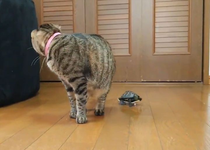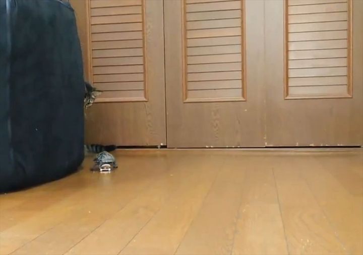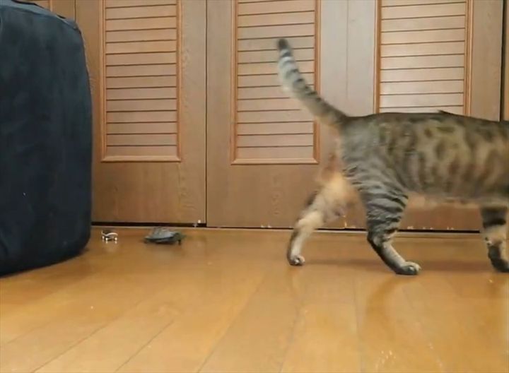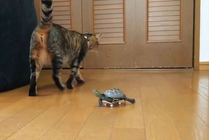 3. ボードを乗りこなしてネコを追うクサガメが話題に「何度見ても笑えちゃう」「ちゃんと待っててくれる」