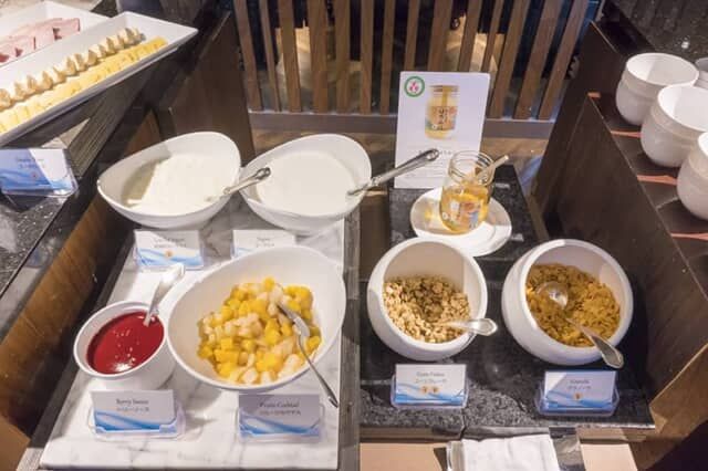 ヨーグルトにはフルーツカクテルが用意され、ベリーソースが添えられます。シリアルやグラノーラもありました。