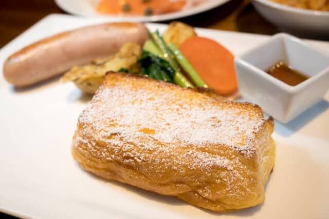メインディッシュの中でも驚かされたのがフレンチトースト。ホテルのお店「 Bakery & Pastry Shop (ベーカリーアンドペストリーショップ)」で売っている食パン “極-kiwami” は、北海道産の高級たまごや牛乳、小麦粉、バターなど、厳選した素材で作られた食パンで、甘みがあってしっとりとした食感です。そんな極-kiwami が分厚くカットされ存在感たっぷり。東京の卵や「東京牛乳」が使われた卵液がよく染みていて、ソーセージの塩味とも相性抜群。このフレンチトーストをまた食べに泊まりたくなる絶品です。