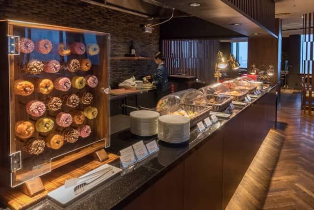 朝食はメイン料理とサイドメニューをそれぞれ1つずつ選ぶ洋食か、和朝食のどちらかをチョイス。加えてブッフェ料理やパン、サラダ、フルーツなどは自由に選べるハーフブッフェスタイルです。ブッフェテーブルには色とりどりのドーナツをはじめ、様々な種類のパンなどが並んでいました。