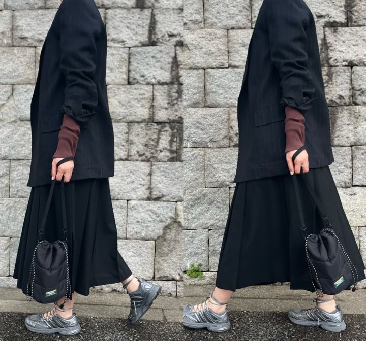 【L.L.Bean】とのコラボ巾着ポシェットを見て、まず目を引いたのは生地感。この手のアイテムって光沢強めの生地を使っていることが多く、それがスタイリングの難易度を高めている要因だったするんです。でもこちらは、パデッド生地なのにマットな風合いというのが◎。それによってがぜん取り入れやすくなりますし、想像以上に街にマッチするルックスに仕上がっているのです。