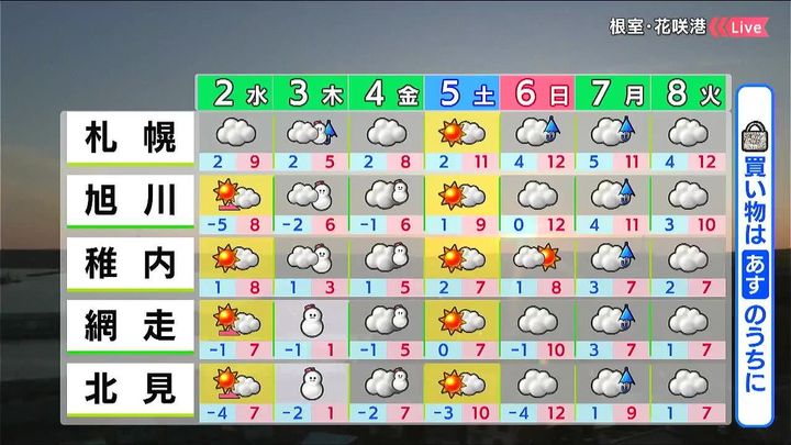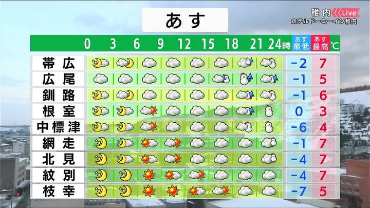 道東は雲に覆われます。夜は湿った雪が降り、うっすら積もるでしょう。オホーツク海側は穏やかに晴れる見込みです。買い物などあすの日ざしを有効にお使いください。
