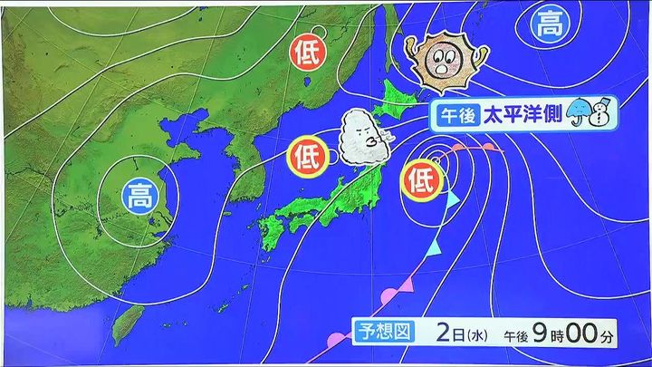 2日(水)夜9時の予想天気図で見ると、原因は本州から近づく2つの低気圧です。雲が太陽を追いやって、曇り空に変わり、午後は太平洋側で雨や雪が降ります。