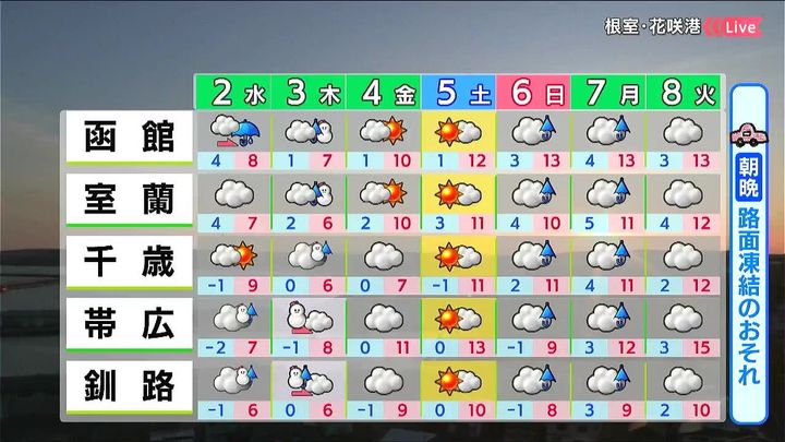木曜の雪は道東で朝まで、道南方面は一日を通して降りやすいでしょう。金曜は雪はやみますが、最低気温は0度前後なので、路面凍結に注意して下さい。
