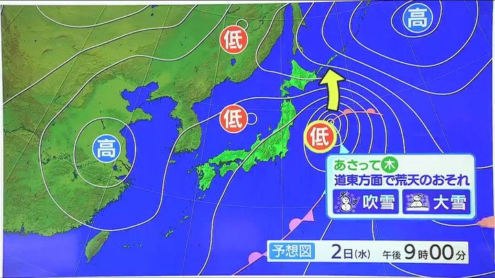 3日(木)になると三陸沖の低気圧が発達しながら北海道の東へ進みます。全道的に雪が降り、低気圧に近い道東方面では、吹雪や大雪となるおそれがあります。