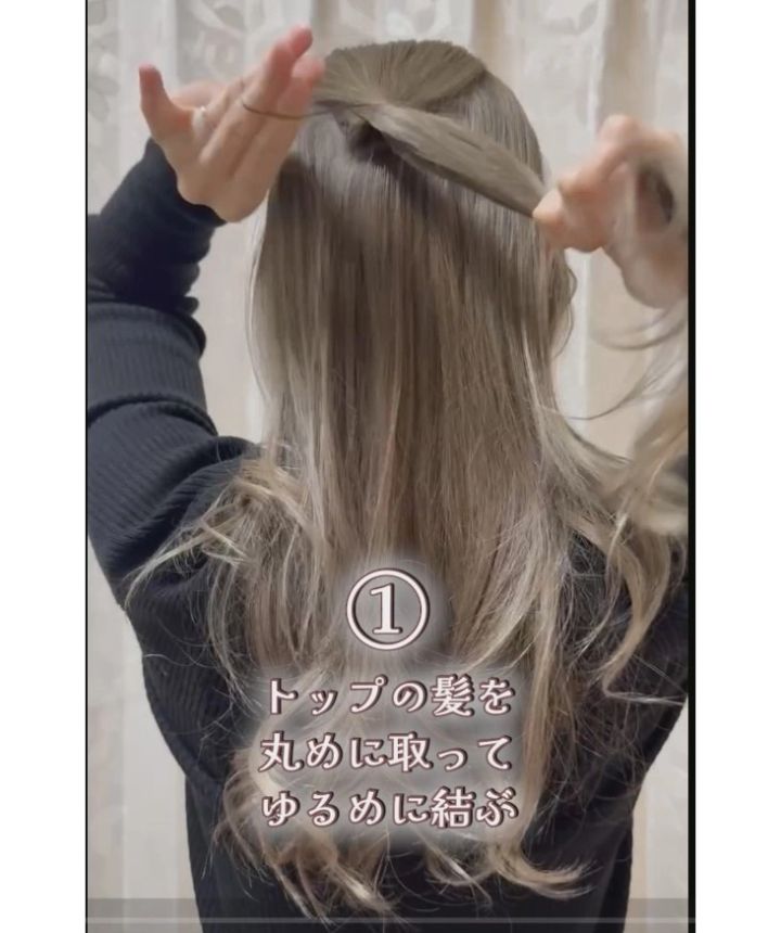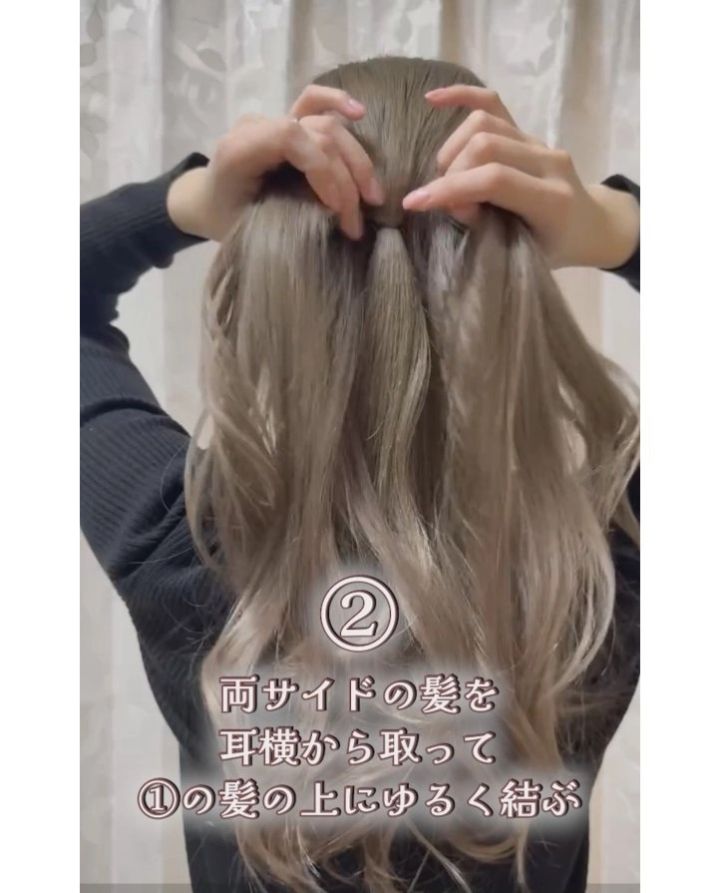 2. 両サイドの髪を耳横からとって1の髪の上にゆるく結ぶ