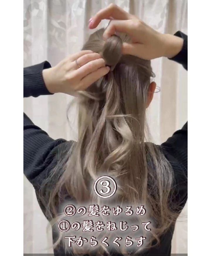 3. 2の髪をゆるめてねじり、1の髪を2の下からくぐらせる