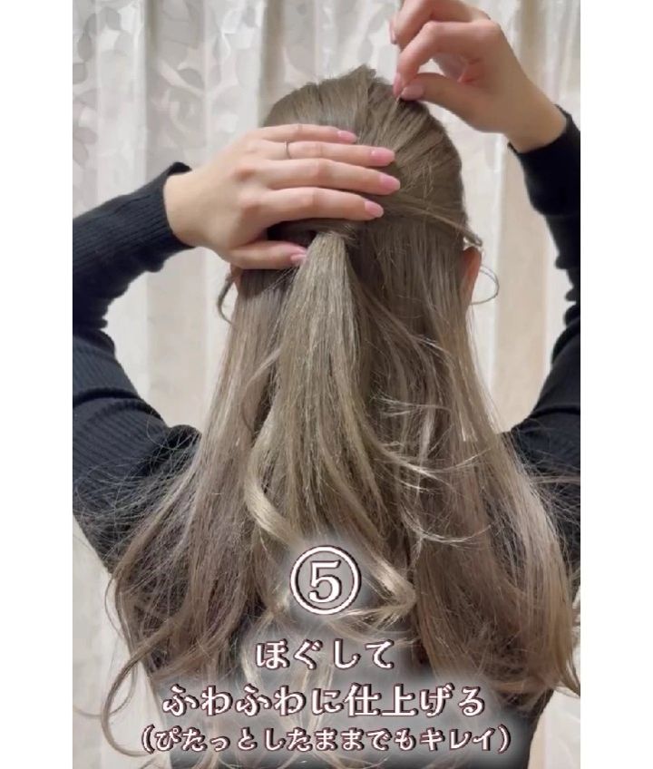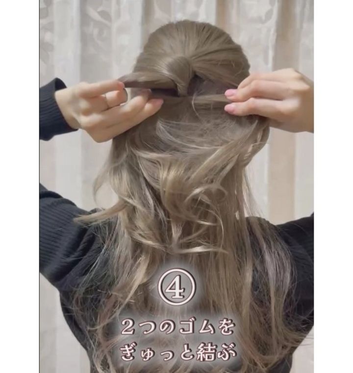 髪の毛は巻いても巻かなくても上品で華やかに仕上がるそう。使用するヘアゴムは2本とも細いゴムが使いやすいですよ♡