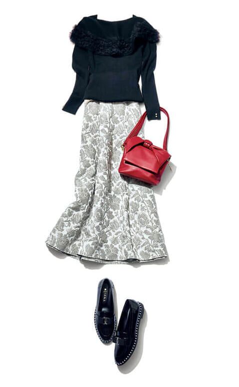 スカート¥17,600/MERCURYDUO ニット¥6,490/tocco closet バッグ¥4,398/grove(ワールド プレスインフォメーション) 靴¥17,600/ダイアナ(ダイアナ 銀座本店)
