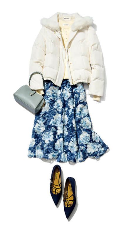 ダウンコートの量感も花柄スカートの存在感で軽減。