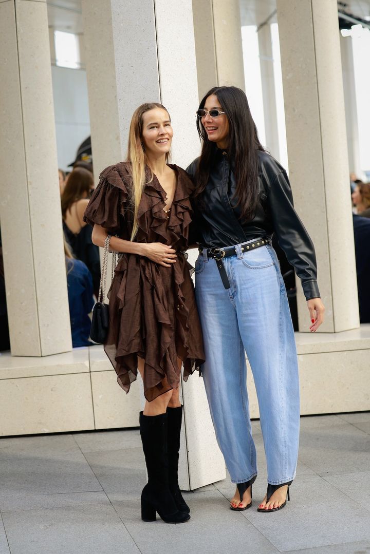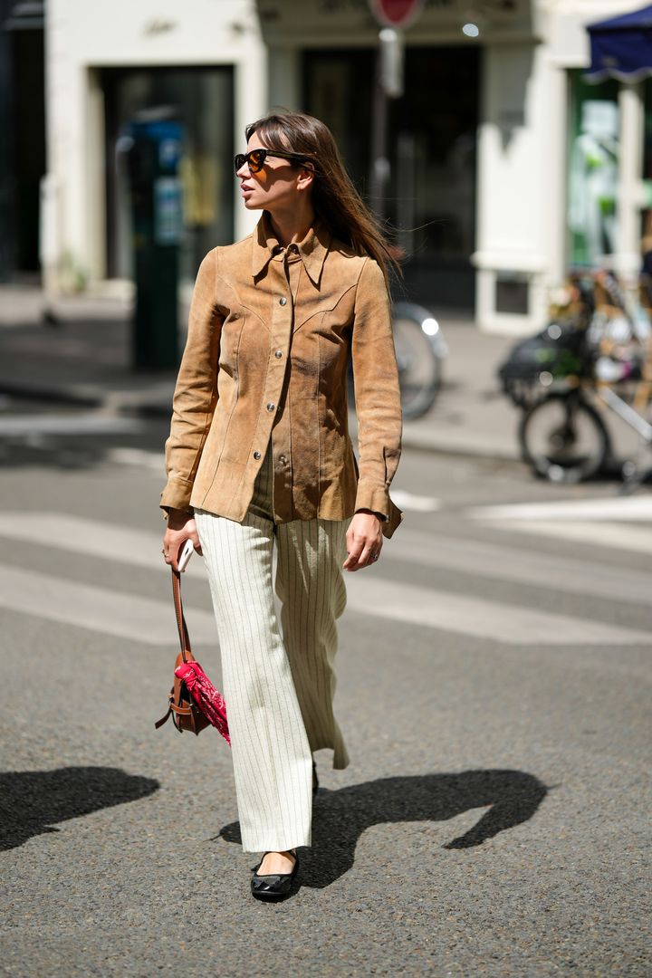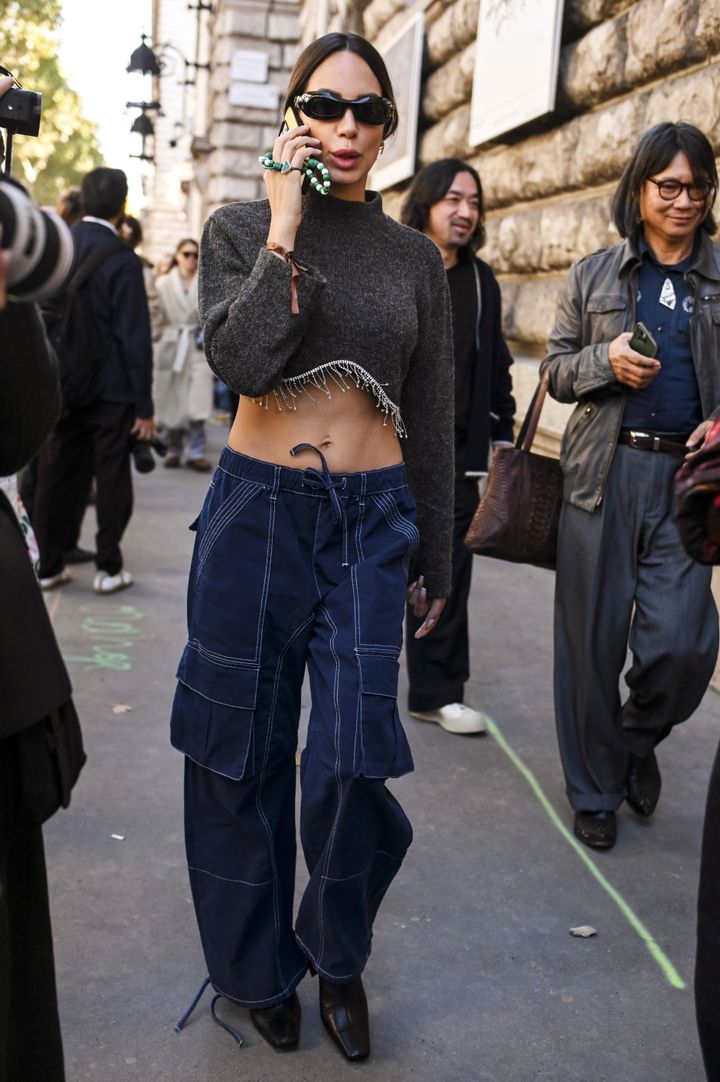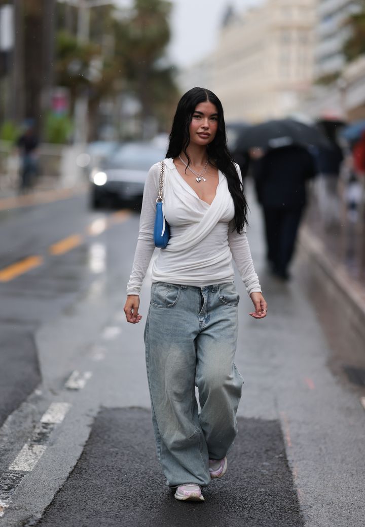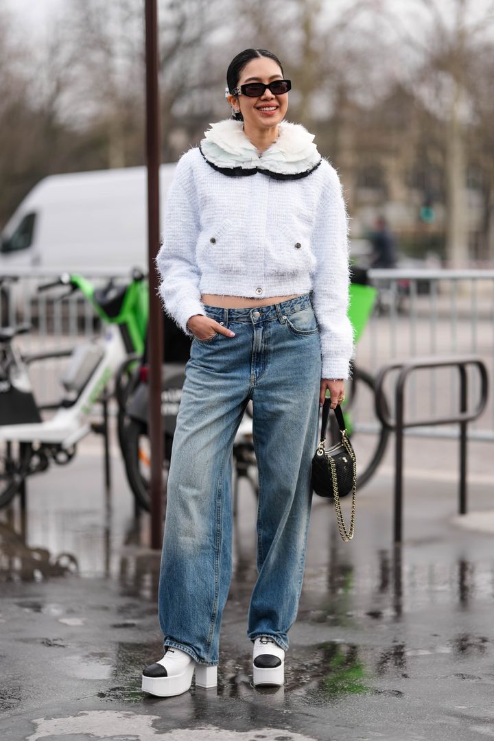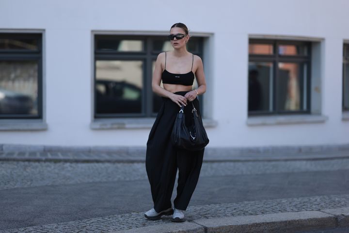 上の2つのスナップから分かるように、ワイドパンツにはシンプルなバレエシューズがフィットする。たとえば、ブラックのチューブトップ、ベルト、ややワイドなジーンズにシンプルなバレエシューズを合わせたコーデは、ほんのりY2Kな完成度の高いスタイルに。シルバーのバッグやアクセサリーによるさりげないアクセントも◎。
