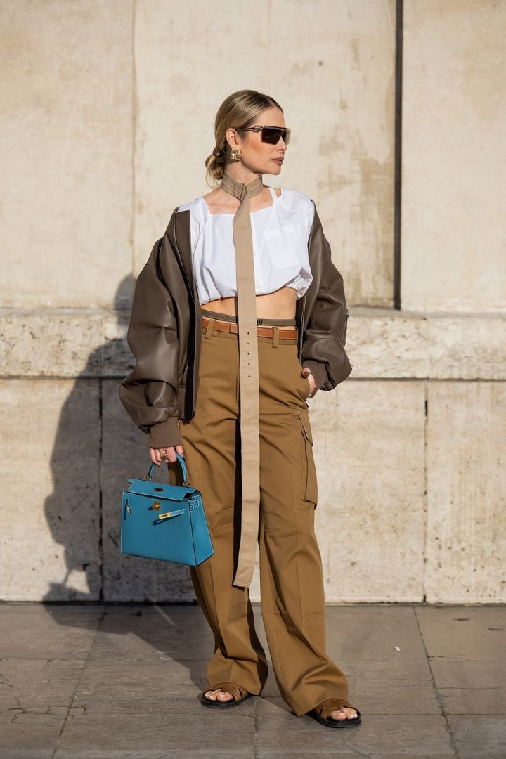 プラットフォームのブーツも、ワイドパンツに馴染みやすい。トップにタイトなアイテムを選んで、ボトムとのコントラストをつけ、しっかりとスタイルアップを狙いたい。トップの肌見せで抜け感を演出すれば、よりスタイリッシュな印象に。上のスナップのようにクロップド丈のアウターで自然にチラ見せするのが一押しだ。